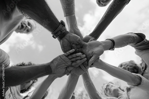 hand, oneness, diversity, connection, togetherness, teamwork, support, cooperation, community, people, group, gathering, meeting, alliance, partnership, solidarity, agreements, success, goal, achievement, celebration, joy, happiness, friendship, family, strength, power, trust, faith, hope, future, together, sky, cloud, light, bright, outdoors, natural, black, white, monochrome, bw, greyscale, closeup, perspective, low angle, huddle, circle, overlap