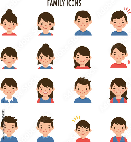 family, icon, people, face, cartoon, illustration, children, happy, cheerful, set, collection, group, avatar, character, boy, girl, man, woman, cute, drawing, vector, graphic, design, element, isolated, white, background, communication, community, togetherness, diversity, parenting, childhood, joy, smile, flat, minimalist, simple, modern, art, clip art, iconography, symbol, adorable, friendly