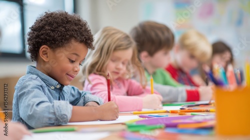 Diverse kindergarten kids drawing and coloring at small tables, focused and