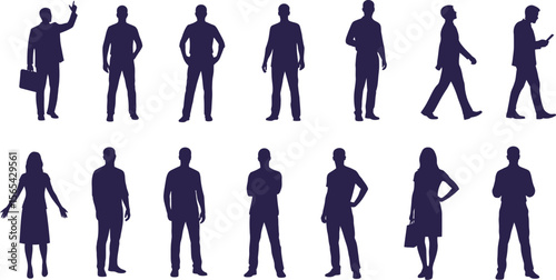 people, silhouette, vector, illustration, pose, position, business, walking, standing, man, woman, group, diversity, office, corporate, casual attire, briefcase, looking, mobile, phone, attaching, dress, arms crossed, businessperson, office worker, casual clothes, mobile device, full body, suit, pointing, human, figure, artwork, graphic, design