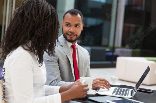 business, group, team, meeting, office, corporate, together, work, executive, professional, men at work, teamwork, manager, project, businessperson, colleague, communication, employee, people, 2, young, man, caucasian, latin, woman, african, american, black, diverse, cafes, breakfast, hot drink, break, discussion, talking, conversation, discussing, technology, computer, laptop, modern, digital, cyberspace, wi-fi, wireless, positive, smiling, side, view, idea