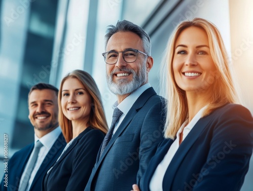 Diverse professional team showcasing confidence and collaboration in modern office setting