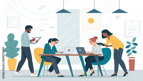working, office, teamwork, collaboration, business, diverse, professional, employee, colleague, meeting, discussion, planning, strategy, modern, workspace, contemporary, digital, technology, laptop, tablet, computer, productivity, efficiency, innovation, startup, company, organisation, corporate, group, people, man, woman, adult, young, interior, desk, table, communication, partnership, success, growth, development, brainstorming, flat, illustration, vector, remote, hybrid, online