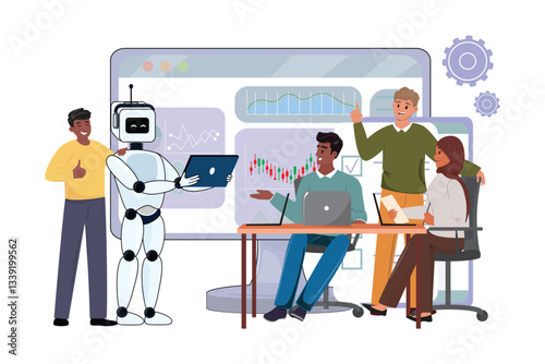 team, diverse, people, man, woman, business, discussion, stock, market, marketing, plan, robot, presenting, graph, chart, artificial, intelligence, laptop, thumb, up, agreements, ai, technology, innovation, collaboration, corporate, strategy, datum, analysis, meeting, brainstorming, integration, futuristic, workspace, colleague, partnership, synergy, multicultural, office, environment, illustration, cartoon, character, group, human, professional, success