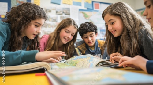 Diverse Students Engaged in Social Studies Project with Books and Maps in Classroom