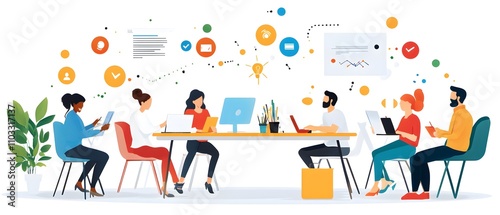 team, teamwork, collaboration, brainstorming, meeting, project, business, office, co-worker, colleague, diverse, multicultural, people, woman, man, laptop, computer, technology, digital, online, cyberspace, communication, connection, network, idea, innovation, creativity, strategy, planning, success, growth, progress, development, workflow, productivity, efficiency, solution, modern, contemporary, design, illustration, graphic, colourful, vibrant, vector, workplace, work