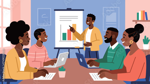 business meeting, teamwork, presentation, collaboration, workplace, professional, corporate, discussion, strategy, diversity, brainstorming, chart, bar chart, learning, training, development, colleague, employee, entrepreneurship, startup, growth, success, communication, management, marketing, flat