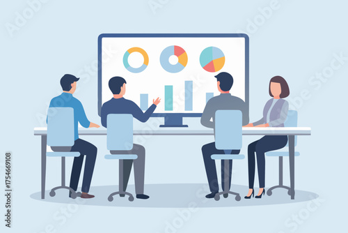 business, meeting, team, collaboration, presentation, office, datum, chart, graph, strategy, planning, discussion, teamwork, corporate, workplace, people, professional, employee, colleague, analysis, report, performance, growth, success, brainstorming, seminar, conference, digital, screen, monitor, project, management, finance, marketing, startup, diversity, inclusion, modern, interior, flat, design, illustration, vector, information, insight