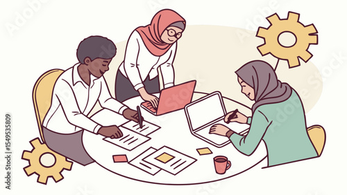 teamwork, collaboration, colleague, project, meeting, team, business, woman, man, diverse, laptop, computer, document, paperwork, planning, strategy, brainstorming, office, work, professional, employee, cooperation, partnership, productivity, success, innovation, technology, digital, modern, workplace, together, group, oneness, effort, achievement, sharpened, concentration, dedication, commitment, result, goal, ambition, progress, development, growth, improvement, efficiency