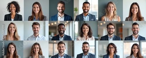 Diverse team members corporate portrait grid. Smiling men and women of different races and ages pose for a group shot. Professionals look happy and confident in business attire.