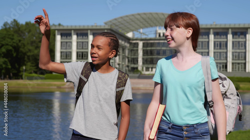 Diverse teenage kids with backpack and book walking in park after school