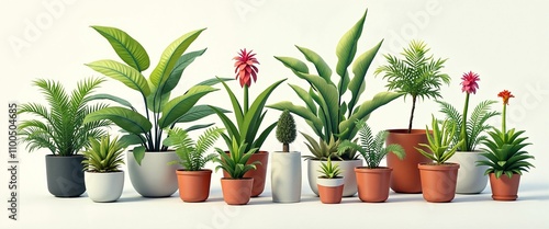 Diverse Tropical Plants in Colorful Pots Representing Indoor Gardening against White Background with Copy Space