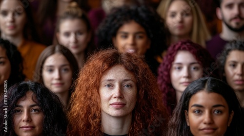 woman, group, portrait, diverse, multicultural, friendship, community, support, togetherness, equality, inclusion, connection, relationship, people, face, expression, crowd, gathering, social, oneness, collaboration, team, female, redhead, curly hair, looking, serious, confident, strong, solidarity