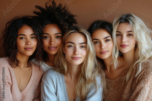 Diverse women in casuals sitting on brown background. Multi-ethnic group of females looking at camera in studio, Generative AI