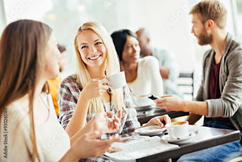 people, friends, drinking, hot drink, tied-up, cafes, diverse, young, caucasian, white, man, woman, adult, socialising, conversation, emotion, activity, lifestyle, relaxation, friendship, inclusion, equity, interaction, multicultural, bonding, communication, leisure, urban, modern, casual attire, happy, togetherness, gathering, enjoyment, male, female, daytime, warmth, community, laughter, comfort, vibrant, cultural, 2, copy space