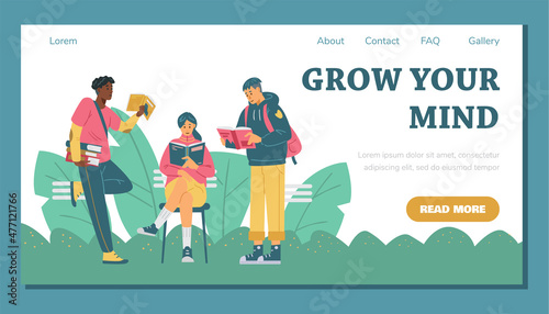 Diversity student reader flat vector landing page. Group of black and white students sit on chair and stand, read books.