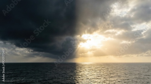 Dividing sky showing dark storm clouds over a calm sea on one side and a bright sunlit sky over sparkling water on the other. Creation of light and dark.