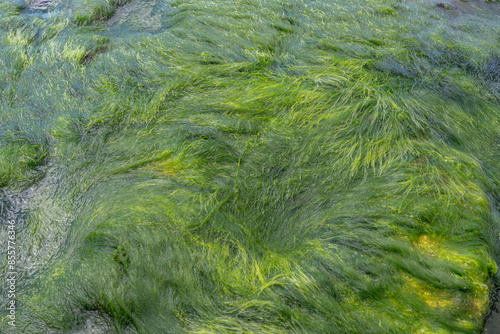 Division Chlorophyta, Green Seaweeds, Laniakea Beach,Oahu's North Shore, Honolulu, Hawaii. Beachrock is a friable to well-cemented sedimentary rock. Salt weathering Tafoni