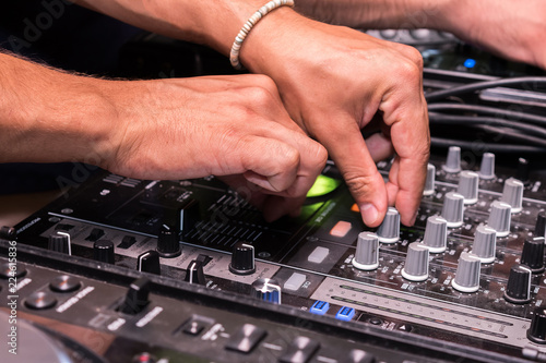 Dj mixes the track in the nightclub at a party. depth of field. closeup.
