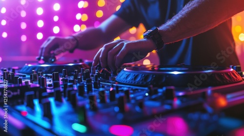 DJ mixing music at a vibrant nightlife event with colorful lights and energetic atmosphere