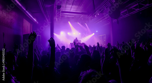 DJ on stage behind DJ mixer, crowd of people in front of him, stage illuminated with bright lights. The concept of a DJ party.