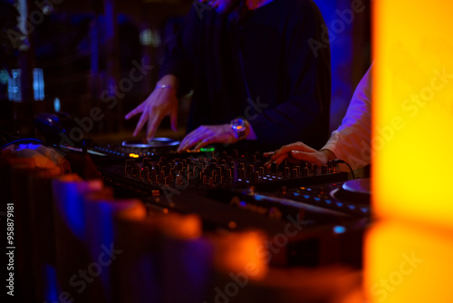 DJ playing music at the nightclub. Close-up of male hands mixing music on midi controller