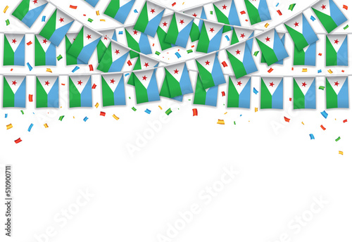 Djibouti flag garland white background with confetti, Hang bunting for Djibouti Independence Day celebration template banner, Vector illustration