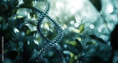 DNA helix surrounded by lush greenery and soft lighting.