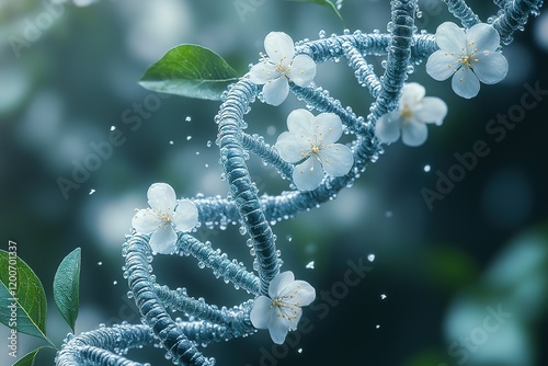 DNA strand entwined with delicate blossoms, symbolizing the beauty of life's genetic code.