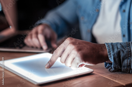 Do it. Competent man putting arms on the table and testing tablet while being at his workplace