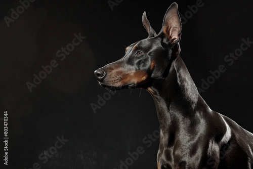Doberman black, tall Doberman on a black background looking to the side. Close-up photograph of the animal. Advertising banner.