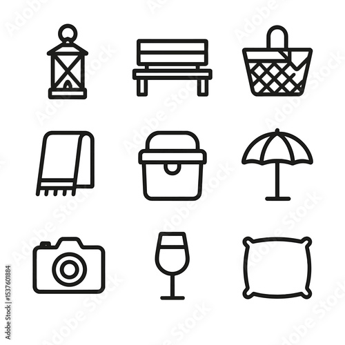dockside, icon, set, outline, accessory, lantern, bench, picnic, basket, towel, cooler, umbrella, camera, drink, glasses, cushion, line, icon