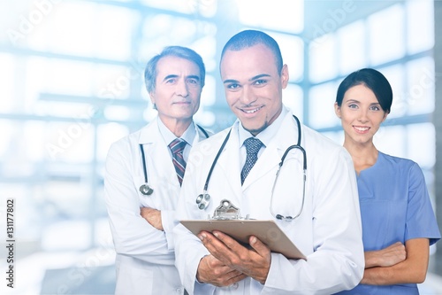 doctor, check-up, nurse, team, hospital, cheerful, occupation, happiness, professional occupation, standing, expertise, young adult, confidence, stethoscope, report, teamwork, togetherness, clipboard, partnership, portrait, general practitioner, horizontal, front view, medical equipment