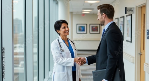 doctor, business, handshake, hospital, corridor, meeting, professional, health care, agreements, collaboration, partnership, interaction, suit, medicals, office, teamwork, smiling, communication, indoor, people, male, female, greeting, cooperation, successful, environment, health, care, medicine, workplace, trust, connection, human relationships, executive, corporate, formal, consultation, staff, personnel, positive, confident, conversation, negotiation, leadership, oneness