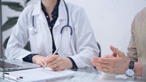 Doctor and patient are talking in clinic after health check up. Female physician is making notes. Medicine concept