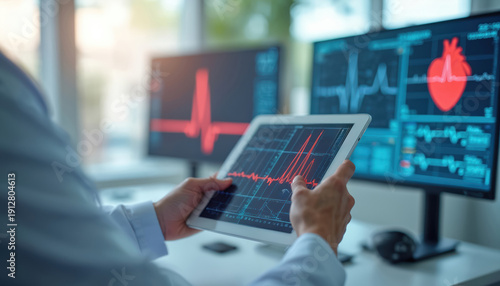 Doctor checks patient data on tablet and computer. Medical graphs and heart symbol display vital signs. Healthcare technology analyzes body metrics for diagnosis.