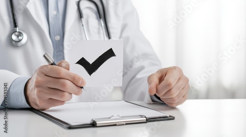 Doctor completing a patient satisfaction survey, marking important feedback with a check mark