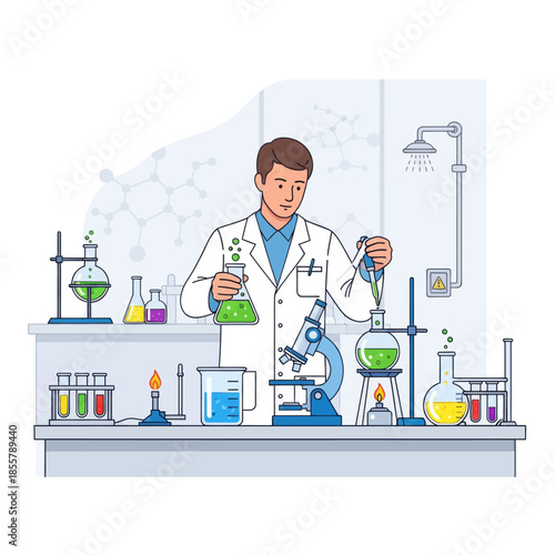 Doctor Conducting Scientific Experiment in Modern Laboratory with Lab Equipment and Chemicals
