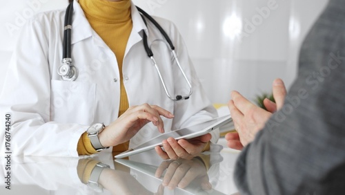 Doctor consulting patient using digital tablet, explaining medical information during modern healthcare appointment. Medicine, healthcare and science concept