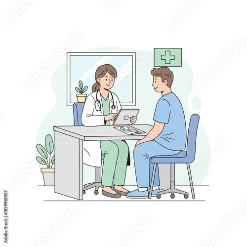 one person, two people, doctor, patient, medical office, clinic, hospital, consultation, exam, indoor, day, eye-level, sitting, conversation, professional, health, wellness, care, assistance, support, trust, modern, clean, simple, vector, illustration, graphic, line art, medical professional, well-being, positive, friendly, communication, technology, desk, chair, medicals, treatment, diagnosis