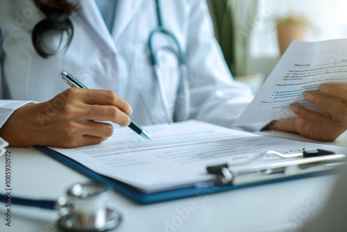 doctor, medicals, document, exam, health care, hand, pointing, paper, clipboard, pen, stethoscope, white, coat, professional, health, care, review, diagnosis, treatment, hospital, clinic, patient, record, note, prescription, analysis, form, table, desk, office, sharpened, closeup, detail, work, professionalism, expertise, assistance, information