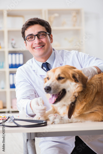 Doctor examining golden retriever dog in vet clinic