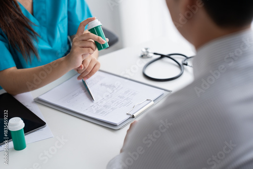 Doctor Explaining Medication Instructions to Patient at Clinic.