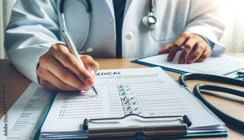 Doctor filling out a medical form on a clipboard with a pen, stethoscope nearby, providing healthcare services in a clinical setting.