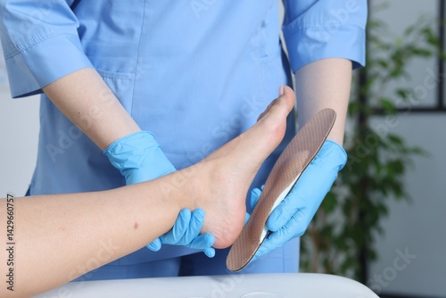 Doctor fitting insole to patient's foot in hospital, closeup