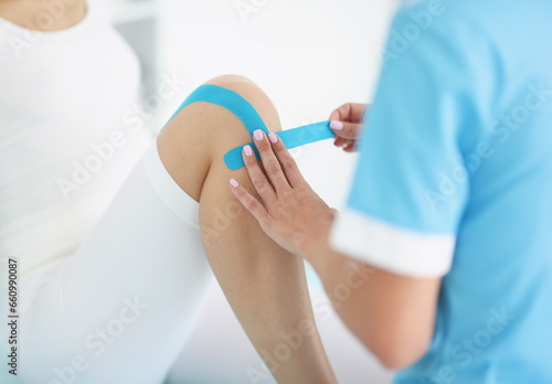 Doctor glues kinesio tape to patient's knee. Injuries and sprains of joints and muscles concept