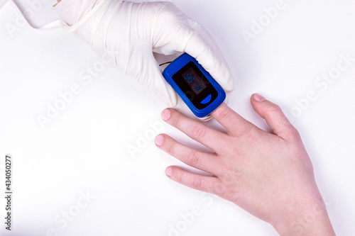 Doctor hand in white medical latex gloves hold patients hand with pulse oximetry on the finger. Noninvasive and painless oxygen saturation level test. Part of set.