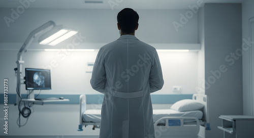 doctor, hospital, medicals, health care, patient, room, white coat, backview, physician, clinic, treatment, exam, diagnosis, care, professional, medicine, health, emergency, ward, bed, monitor, equipment, sterile, clean, modern, indoor, interior, medical professional, medical equipment, hospital room, medical treatment, healthcare professional