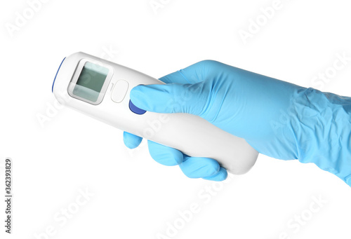 Doctor in latex gloves holding non-contact infrared thermometer on white background, closeup