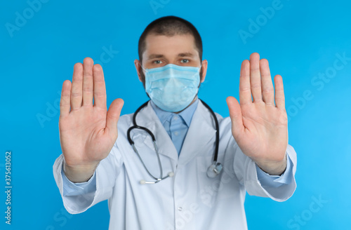Doctor in protective mask showing stop gesture on light blue background. Prevent spreading of coronavirus